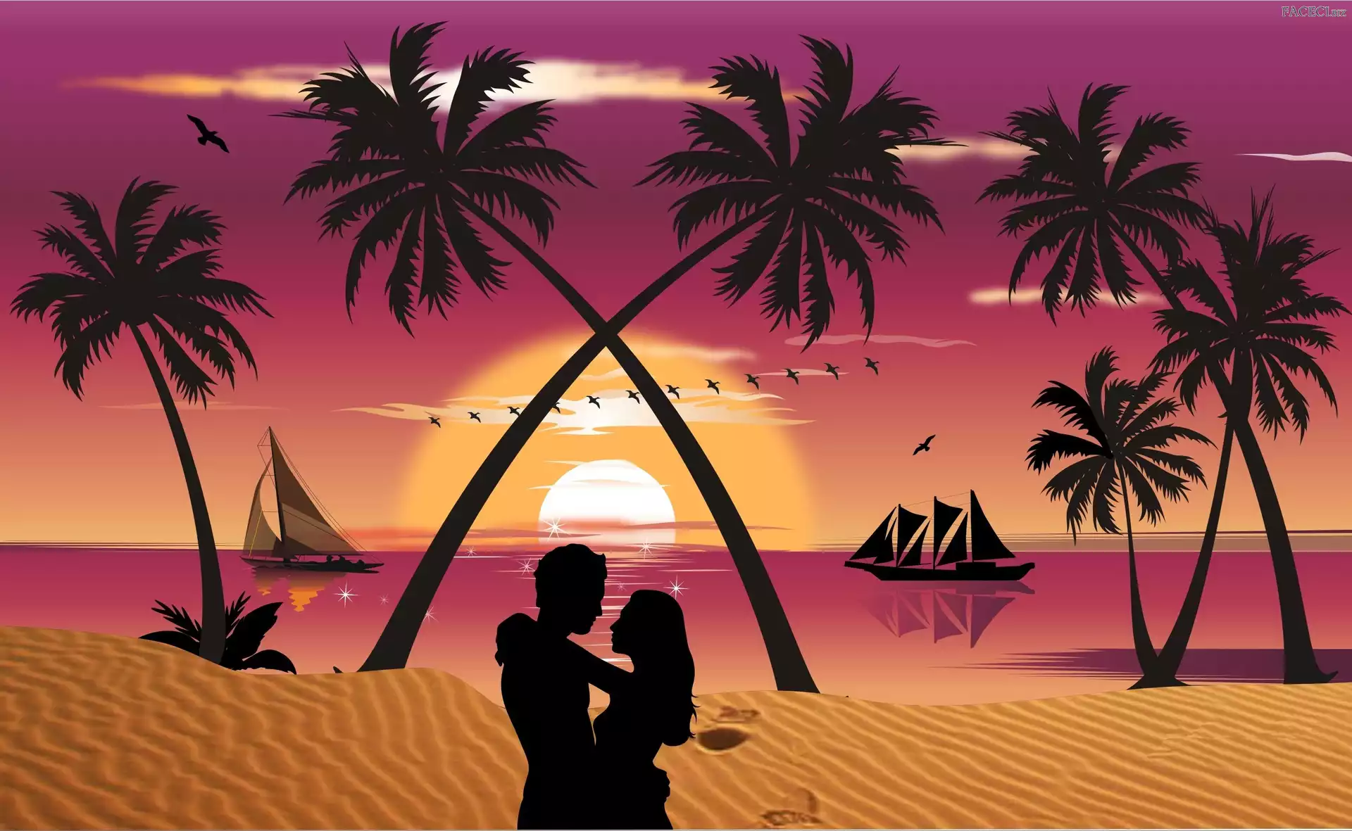 Kobieta, Mężczyzna, Plaża, Morze, Palmy